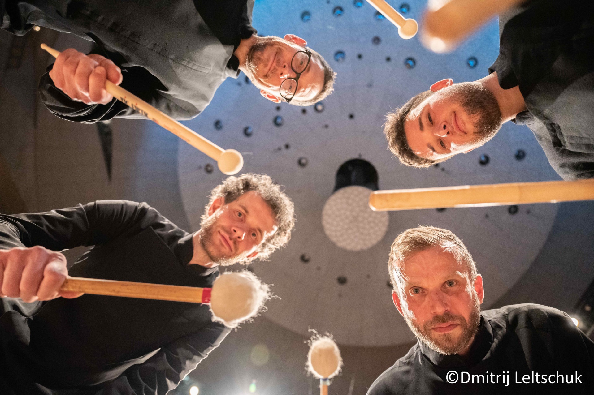 Die Mitglieder des Elbtonal Percussion mit Jan-Frederick Behrend, Francisco Manuel Anguas Rodriguez, Stephan Krause, Sönke Schreiber beherrschen den „kreativen Crossover“ aus Klassik, Jazz und Weltmusik. Mit Trommeln, Marimba- und Vibraphon und einer Sammlung zweckentfremdeter