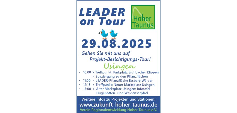Der Verein Regionalentwicklung Hoher Taunus und das Regionalmanagement laden für Freitag, 29. August 2025 alle interessierten Bürgerinnen und Bürger herzlich zu "LEADER on Tour" nach Usingen ein.