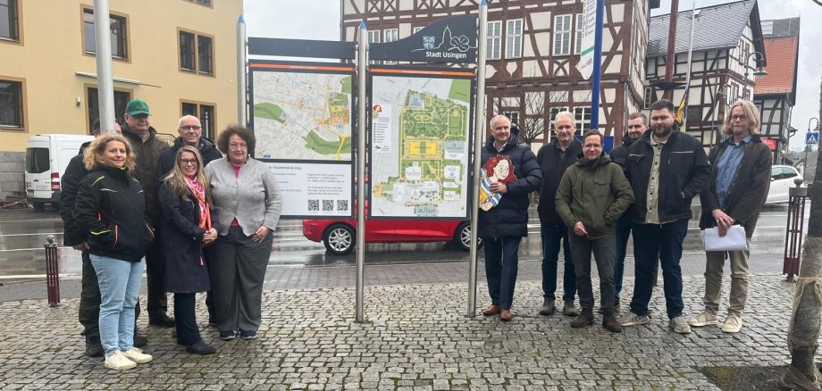 Im Rahmen eines Pressetermins konnte Bürgermeister Steffen Wernard eine große Projektgruppe begrüßen, die sich im vergangenen Jahr intensiv um die neue Beschilderung auf dem Schlossgarten-Campus und in der Innenstadt von Usingen gekümmert hat.