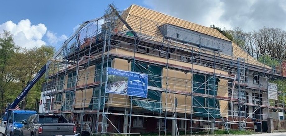 Nachdem die Zimmerleute den Erweiterungsbau aufgeschlagen haben, sind mittlerweile die Dachdecker und Spengler vor Ort und erneuern die desolate Schiefer-Dachfläche des gesamten Walmdaches mit Gaubeneinschnitten. Die Dachfläche der Südseite wird während der Eindeckung mit einer passenden Unter-Tragkonstruktion zur Aufnahme der Photovoltaik-Module hergerichtet. Altlasten des Daches wurden alle abgebrochen und die gesamte Dachfläche sach- und fachgerecht überarbeitet.
